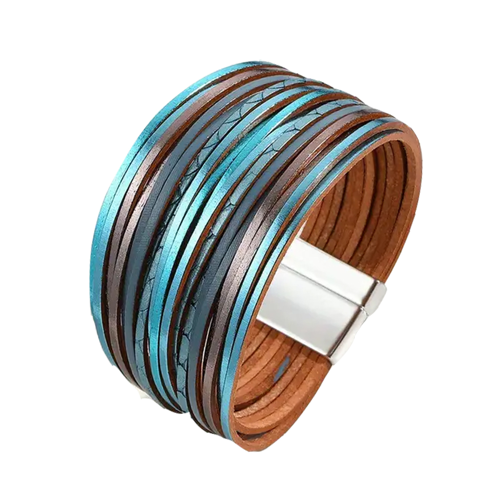 - Гривните са изработени от висококачествена екологична еко кожа, която съчетава стил, издръжливост и комфорт при носене. Материалът е мек и приятен на допир, като запазва естествения вид и текстура на истинската кожа, но без да съдържа животински съставки. Изкуствената кожа е устойчива на износване и запазва формата и цвета си дори при продължителна употреба. Тя е лесна за поддръжка, не абсорбира влага и не избледнява при слънчева светлина, което я прави идеален избор за всекидневни и артистични бижута в стил „Бохо“.
