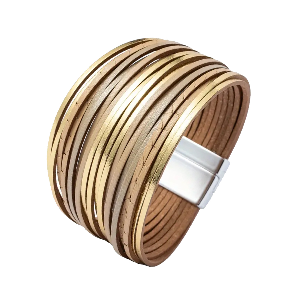 - Гривните са изработени от висококачествена екологична еко кожа, която съчетава стил, издръжливост и комфорт при носене. Материалът е мек и приятен на допир, като запазва естествения вид и текстура на истинската кожа, но без да съдържа животински съставки. Изкуствената кожа е устойчива на износване и запазва формата и цвета си дори при продължителна употреба. Тя е лесна за поддръжка, не абсорбира влага и не избледнява при слънчева светлина, което я прави идеален избор за всекидневни и артистични бижута в стил „Бохо“.