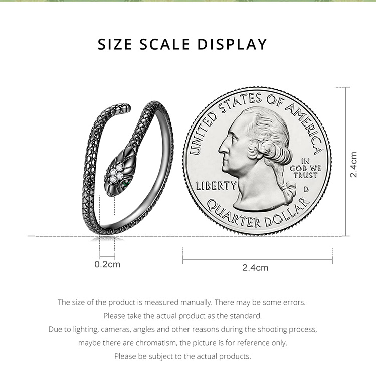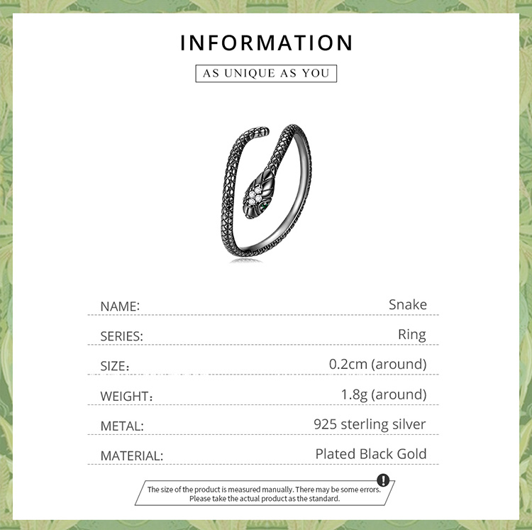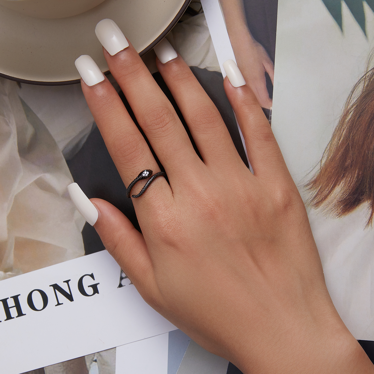 Този впечатляващ сребърен пръстен е вдъхновен от формата на змия – древен символ на трансформация, сила и защита. Изработен от сребро проба 925 с тъмно родиево покритие, моделът се отличава с отворен, обгръщащ дизайн, който елегантно следва линията на пръста. Текстурираната повърхност наподобява змийска кожа, придавайки реализъм и дълбочина на визията. Главата на змията е акцентът на бижуто – украсена с блестящи камъни, които създават впечатляващ контраст и луксозно излъчване, допълнено от фин зелен детайл като око. Дизайнът е смел, модерен и отличителен, подходящ за хора със силно присъствие и индивидуален стил. Въпреки артистичната си визия, пръстенът остава удобен за носене и лесен за комбиниране с други аксесоари. Перфектен избор за акцентно бижу с характер и символика.
