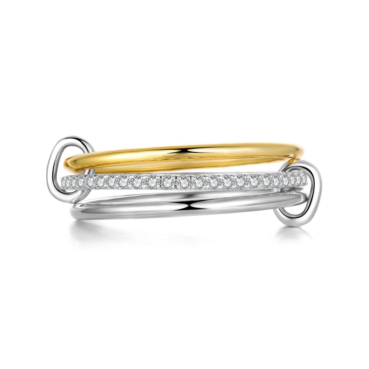 Този стилен сребърен пръстен впечатлява с модерен трислоен дизайн, който съчетава различни текстури и цветове в перфектен баланс. Изработен от сребро проба 925, моделът комбинира класическо сребро с топъл златист акцент и фина линия от блестящи камъни. Трите преплетени елемента символизират хармония, баланс и съвършенство. Централната линия с камъни придава изискан блясък, докато гладките метални повърхности създават усещане за елегантност и модерност. Контрастът между сребристото и златистото покритие прави пръстена универсален и лесен за комбиниране с различни бижута. Дизайнът е едновременно изчистен и впечатляващ, подходящ както за ежедневие, така и за по-официални визии. Това е бижу, което излъчва стил, класа и съвременен лукс.