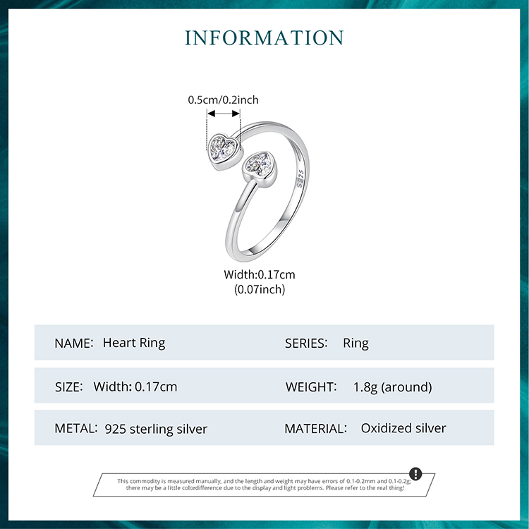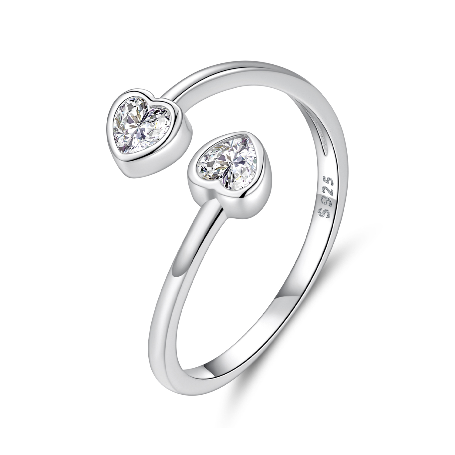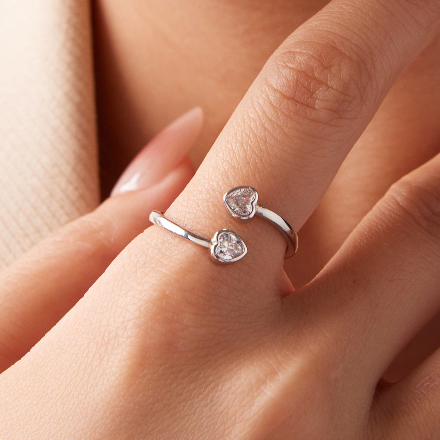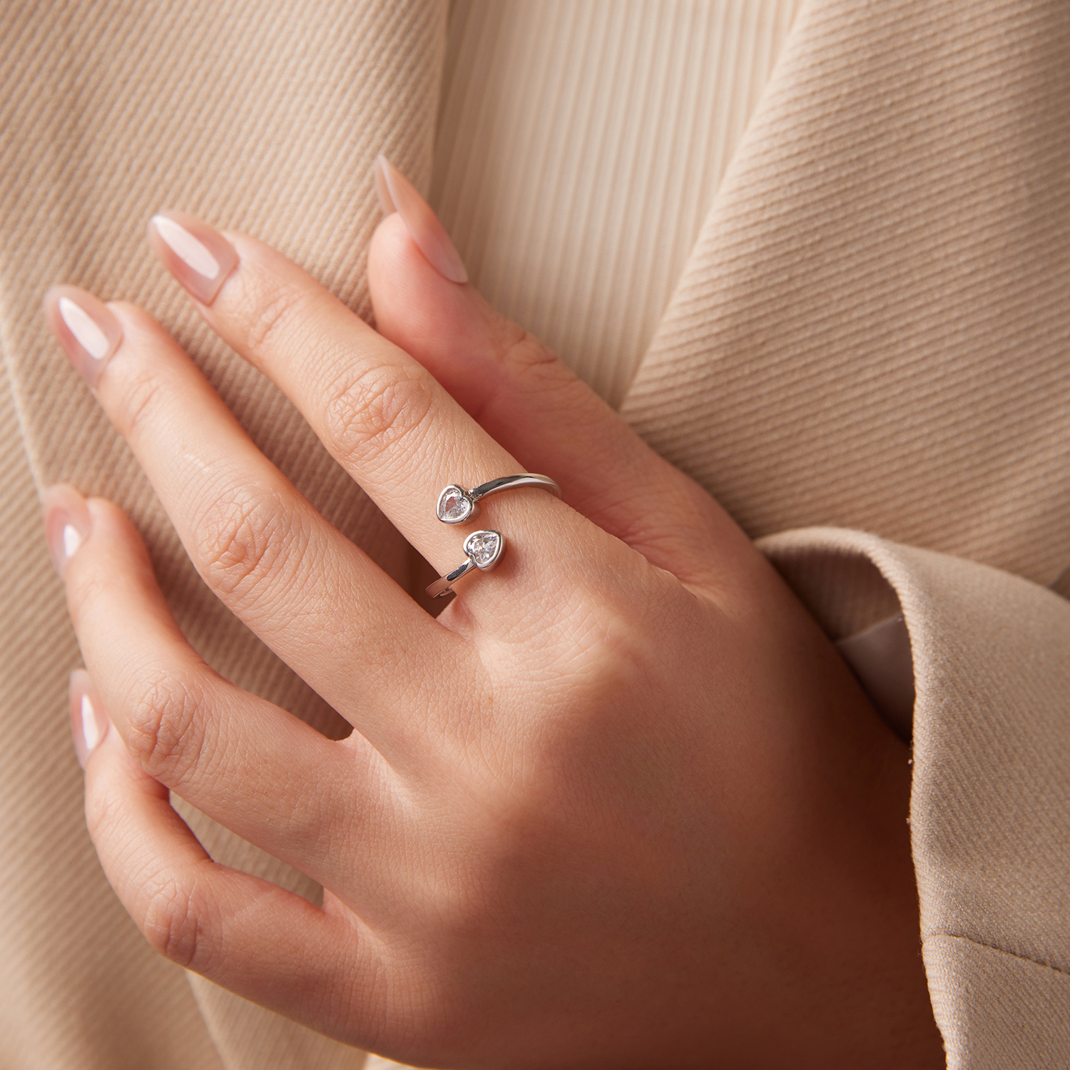 Този нежен сребърен пръстен впечатлява със своя минималистичен и романтичен дизайн, вдъхновен от символа на любовта. Изработен от сребро проба 925, моделът е с отворена конструкция, която позволява лесно регулиране и удобно прилягане. Двата блестящи камъка във форма на сърце са разположени в балансирана композиция, създавайки усещане за свързаност и хармония. Те улавят светлината и придават деликатен, но впечатляващ блясък. Изчистената халка подчертава елегантността на дизайна, без да отвлича вниманието от основните акценти. Пръстенът е подходящ както за ежедневие, така и за специални моменти. Това бижу символизира любов, близост и споделени чувства.