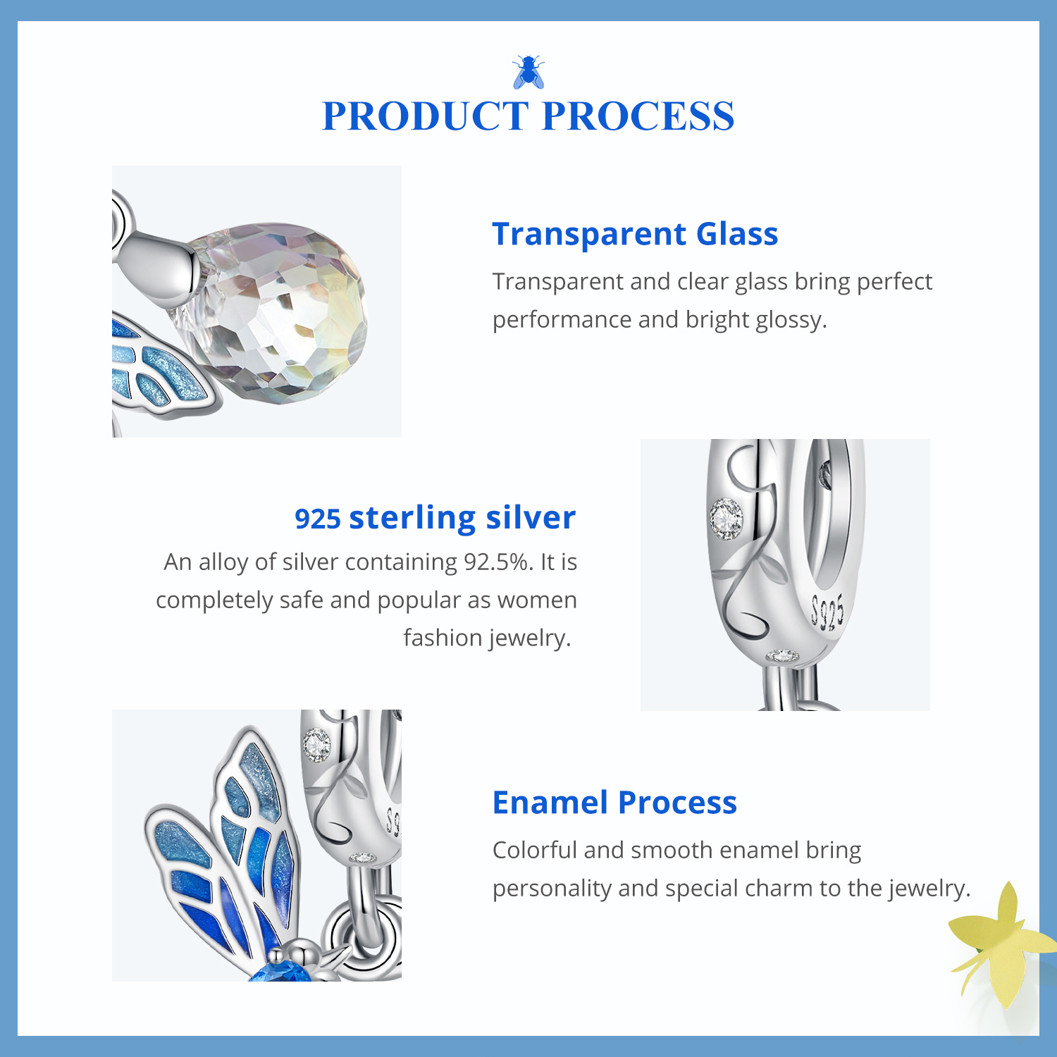 - Висококачествено сребро с покритие от титаний, изработен от чисто сребро проба 925,върху което е нанесен тънък слой родий – рядък, изключително твърд и устойчив на корозия елемент от платиновата група, който придава дълготраен блясък, защитава от потъмняване и надраскване, и осигурява по-луксозен и издръжлив завършек на изделието.