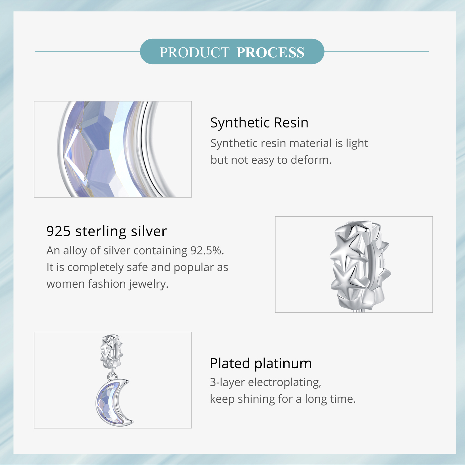 - Висококачествено сребро с покритие от титаний, изработен от чисто сребро проба 925,върху което е нанесен тънък слой родий – рядък, изключително твърд и устойчив на корозия елемент от платиновата група, който придава дълготраен блясък, защитава от потъмняване и надраскване, и осигурява по-луксозен и издръжлив завършек на изделието.
