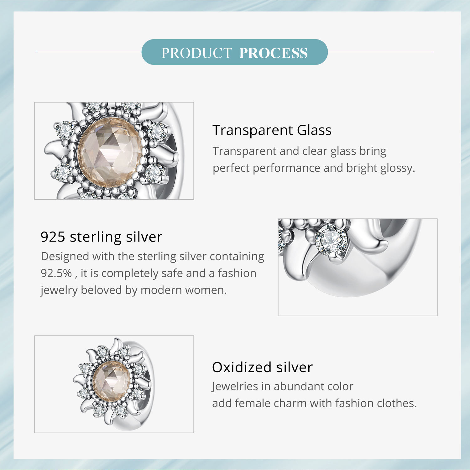 - Висококачествено сребро с покритие от титаний, изработен от чисто сребро проба 925,върху което е нанесен тънък слой родий – рядък, изключително твърд и устойчив на корозия елемент от платиновата група, който придава дълготраен блясък, защитава от потъмняване и надраскване, и осигурява по-луксозен и издръжлив завършек на изделието.