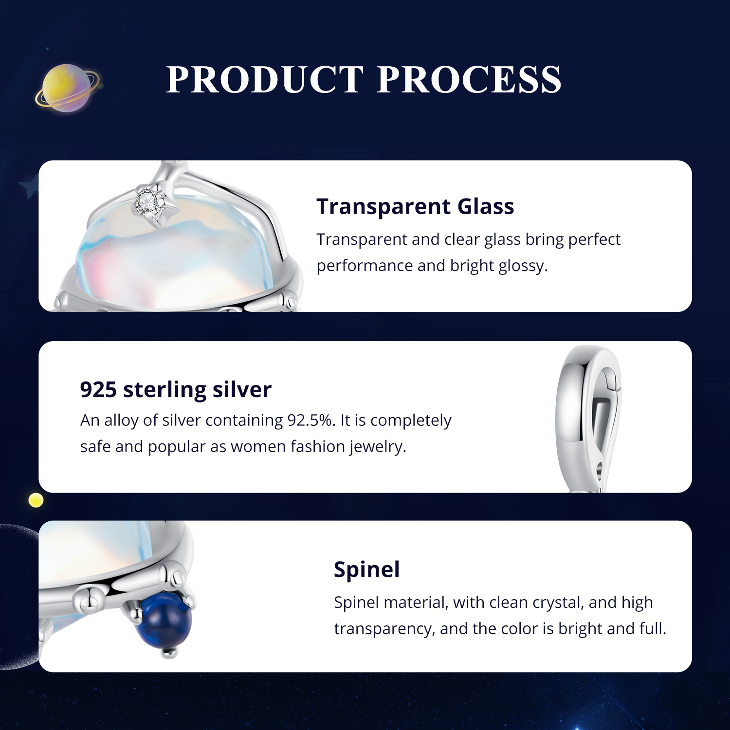 - Висококачествено сребро с покритие от титаний, изработен от чисто сребро проба 925,върху което е нанесен тънък слой родий – рядък, изключително твърд и устойчив на корозия елемент от платиновата група, който придава дълготраен блясък, защитава от потъмняване и надраскване, и осигурява по-луксозен и издръжлив завършек на изделието.